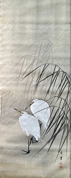 肉筆 白鷺2羽 雪篷筆 落款 彩画 絹本 仮軸 136×45 ¥15,000 |
