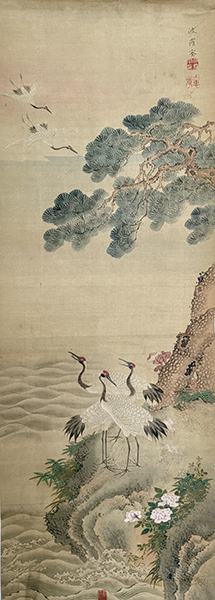 肉筆 海辺鶴五羽 波羅蜜 落款 彩画 絹本まくり ヤケ 95×34 ¥3,000 |