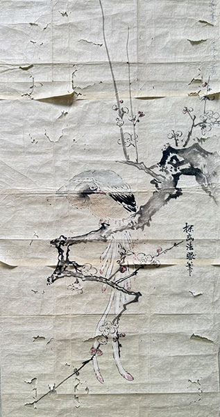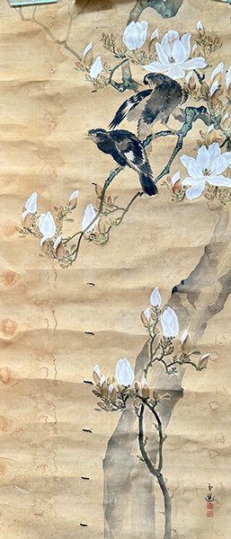 肉筆 モクレンとカラス 雪𦾌 落款 彩画 絹本まくり シミ 123×52 ¥3,000 |