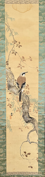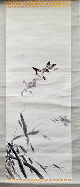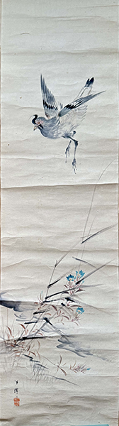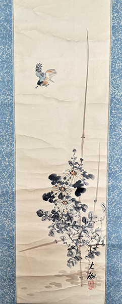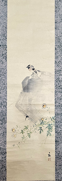 肉筆 小鳥に菊 百鏻落款 彩画 紙本幅 132×31 ¥3,000 |