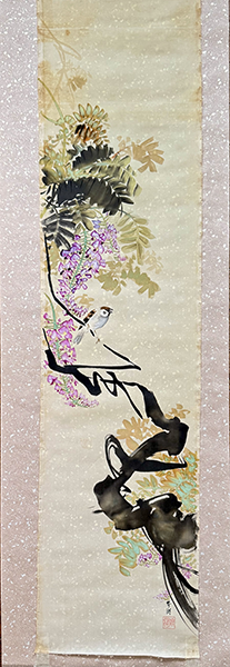肉筆 雀と藤の花 春湖画落款 彩画 絹本仮軸 128×29 ¥12,000 |