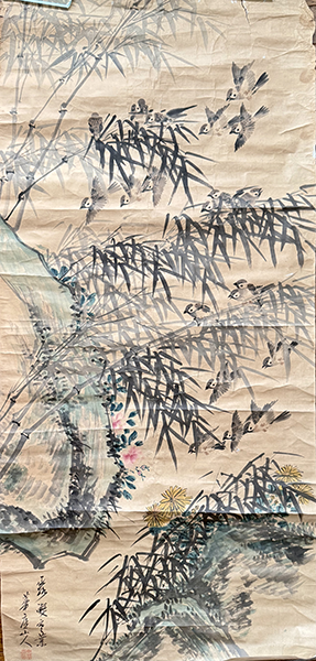 肉筆 竹に群雀 華廬山人 落款 彩画 紙本まくり 127×62 ¥5,000 |