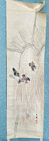 肉筆 わらに雀三羽 天偠 落款 彩画 紙本仮軸 112×31 ¥2,000 |