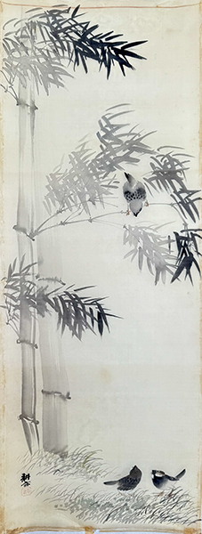 肉筆 竹に雀三羽 耕𤱈 落款 絹本仮軸 119×45 ¥4,000 |