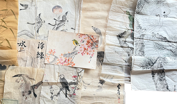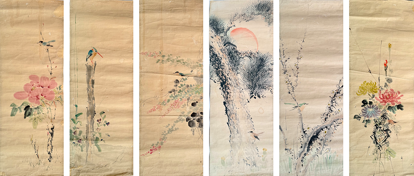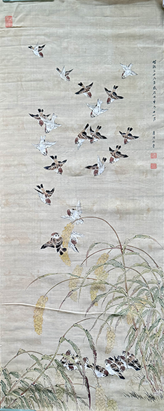 肉筆 群雀 藤蔭画落款 彩画 絹本まくり 共箱 134×53 ¥30,000 |