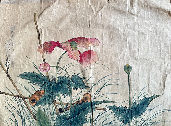 肉筆 ポピーと小鳥二羽 彩画 紙本まくり 36×48 ¥2,000 |