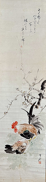 肉筆 にわとり二羽 輝月落款 彩画 紙本まくり 130×33 ¥3,000 |