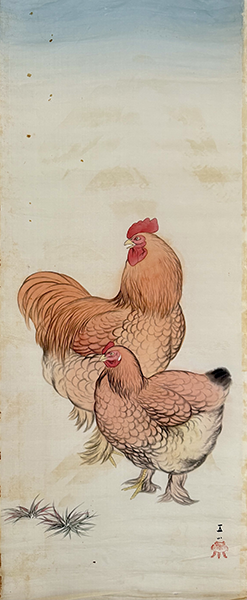 肉筆 鶏二羽 五山 落款 彩画 絹本まくり 138×5 ¥5,000 |