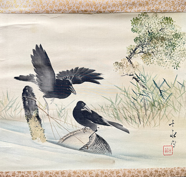 肉筆 カラス二羽 荒木十畝 落款 彩画 絹本幅 33×40 ¥10,000 |