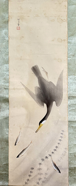 肉筆 魚と鵜 祥司 落款 彩画 絹本幅 共箱 112×35 ¥4,000 |