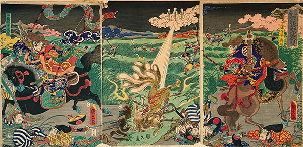 三浦上総両介那須野九尾狐討取 国久画 3枚続 1858 2・B・ろ” 角欠落少 37×25×3 ¥100,000 |