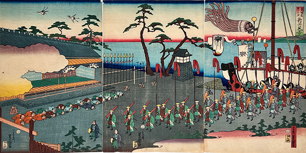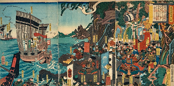 義経蝦夷渡之図 芳虎画 3枚続 1850s 2・B・ろ 36×24.5×3 ¥80,000 |
