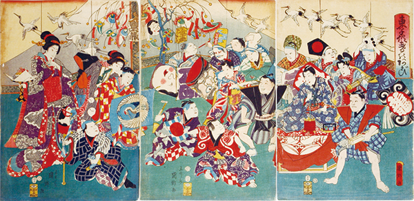 東子供春乃阿そび 国郷画 3枚続 1857s 1・A・ろ 右図右側汚少々 36×24.5×3 ¥300,000 |